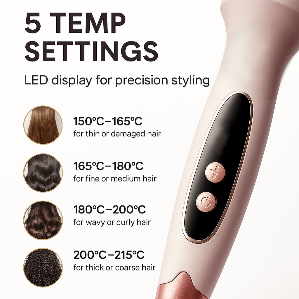 Start with dry hair. Double-click the ON/OFF button to unlock the device, then adjust the temperature using the +/- controls to suit your hair type. Section your hair and gently glide from root to ends, turning slightly to create soft waves and volume. Repeat as needed for a natural, polished finish.